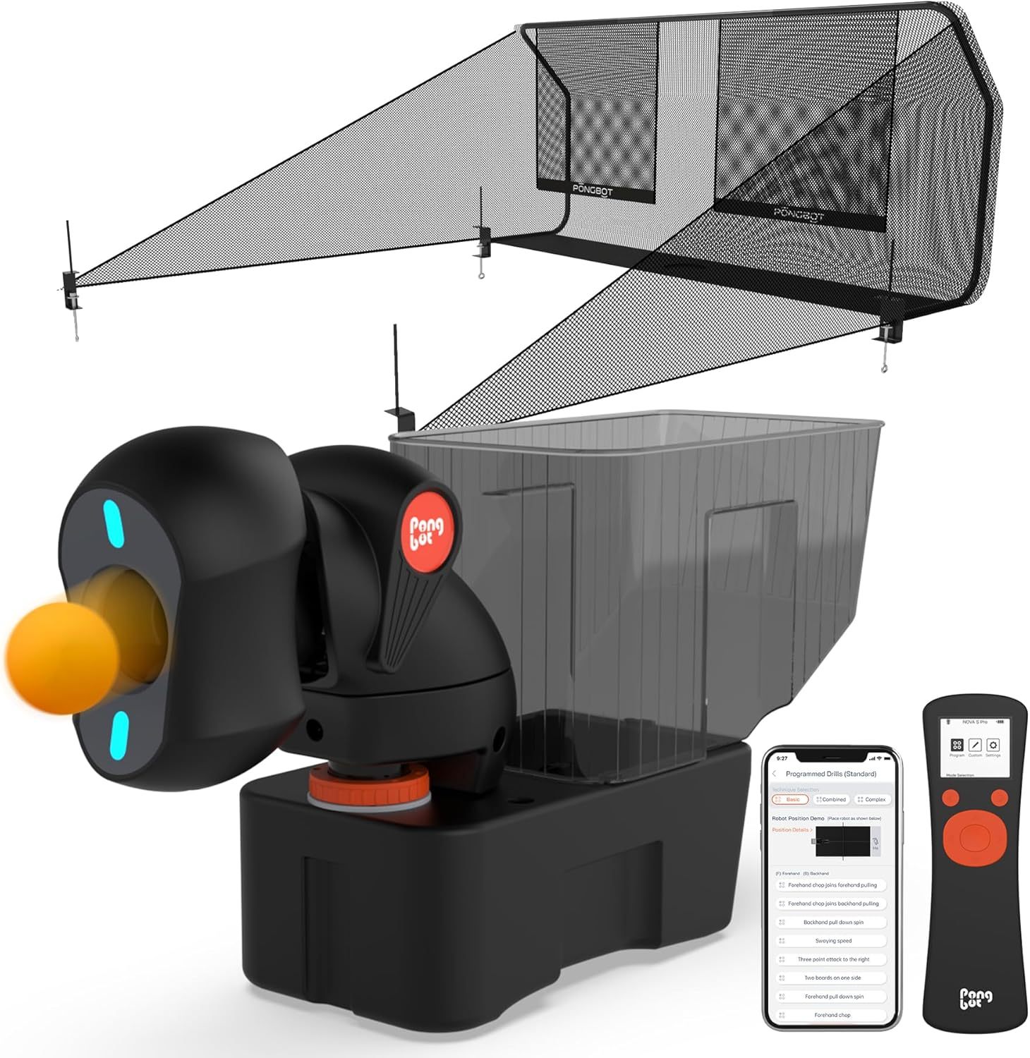 PONGBOT Robot de tenis de mesa con red, máquina de ping pong, control remoto/aplicación, 264 taladros preguardados, taladros personalizados